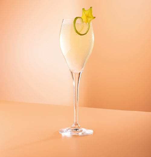 Wlej wszystkie składniki do kieliszka do szampana i uzupełnij świeżo gazowaną wodą SodaStream.