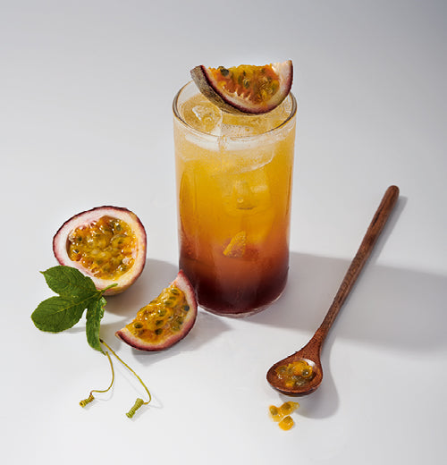 Wlej Campari i Wermut do szklanki, dodaj przecier z marakui i lód oraz uzupełnij wodą gazowaną SodaStream.