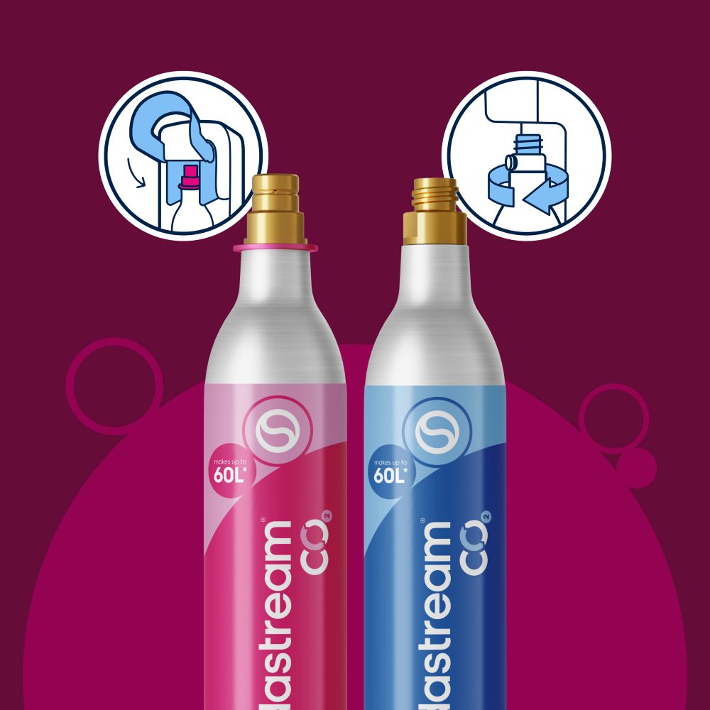 Cylindry gazujące SodaStream z niebieską nylonową owijką są kompatybilne ze wszystkimi ekspresami do wody gazowanej z wkręcanym systemem cylindra (system Twist). Natomiast różowe naboje Quick Connect pasują do saturatorów SodaStream Duo, Terra i Art, które mają różową dźwignię do wymiany cylindrów (Technologia Quick Connect).