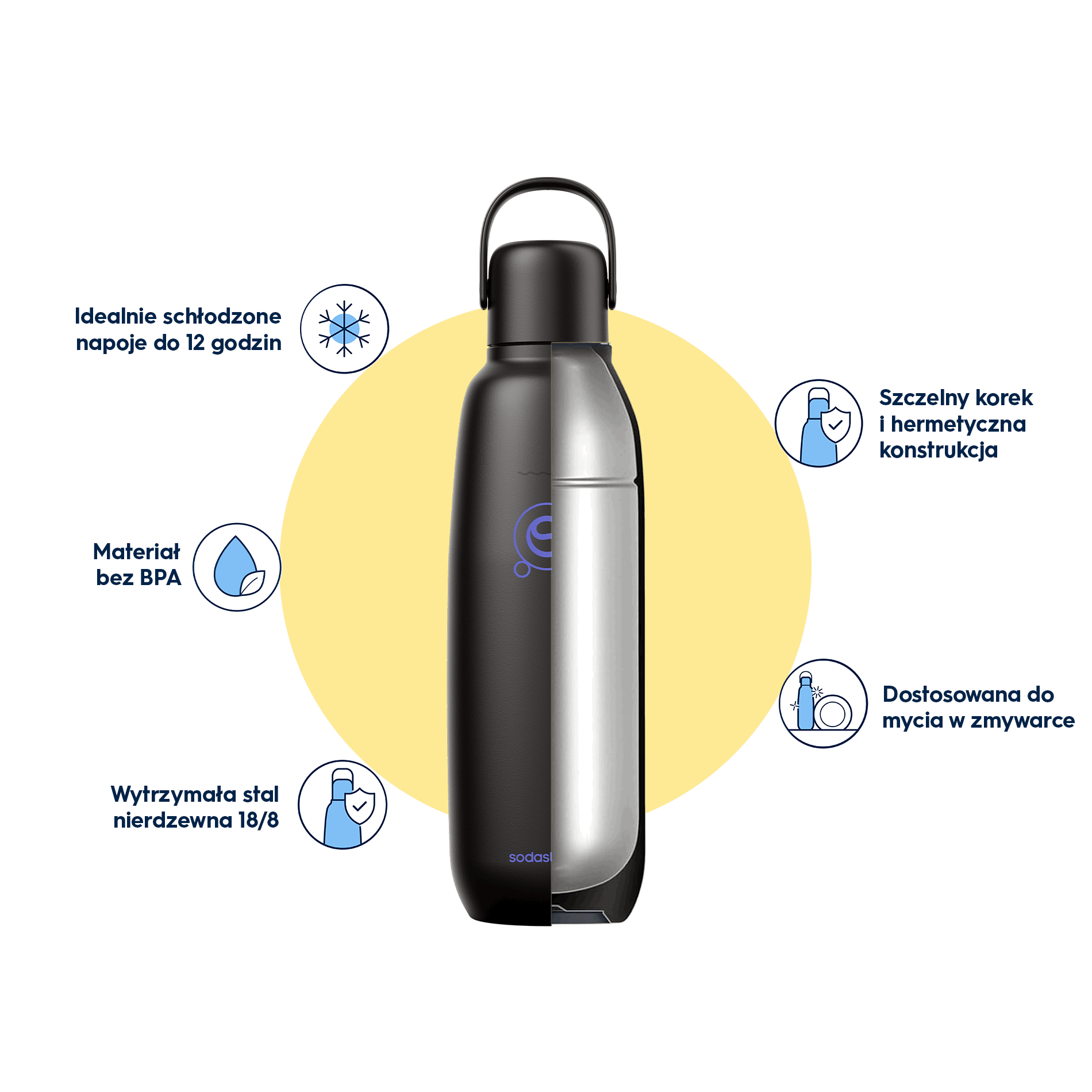 Sodastream fizz & go to coś więcej niż zwykły bidon – to stylowy element Twojego looku, który idealnie dopełnia każde wyjście. Niezależnie czy idziesz na siłownię, do pracy czy na spotkanie ze znajomymi, zapewnia wygodne nawadnianie przez cały dzień. Jest odporna na uszkodzenia i korozję, a przy tym niezwykle szczelna, więc możesz zabrać ją wszędzie bez obaw. Możesz ją bezpiecznie myć w zmywarce, co zwiększa komfort użytkowania. A gdy jesteś w biegu – butelka dotrzyma Ci tempa, utrzymując napój przyjemnie chłodny