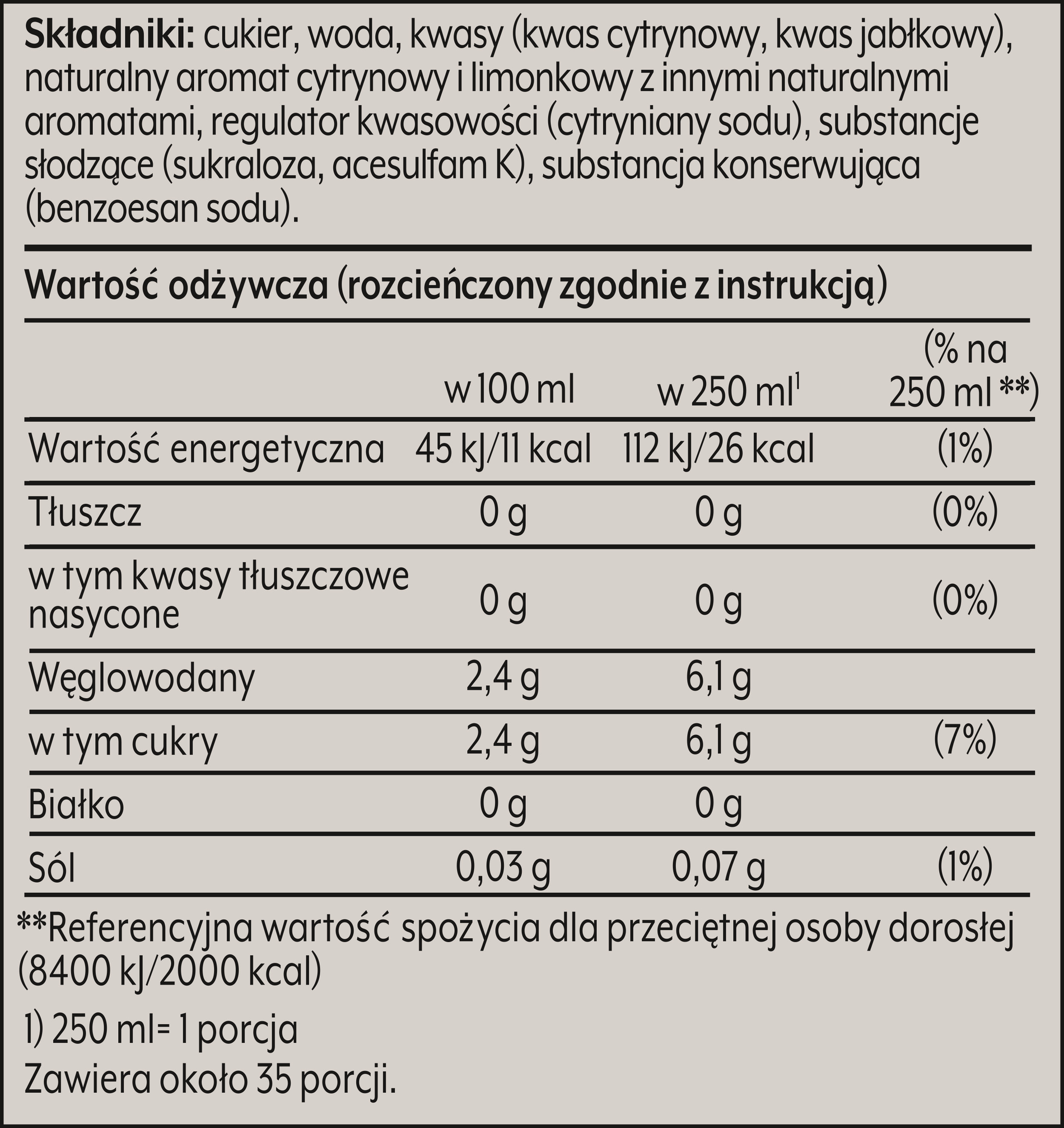 Zagęszczony napój o smaku cytrynowo-limonkowym. Przygotujesz do 9 litrów napoju – jeżeli jest przygotowany zgodnie z instrukcją.