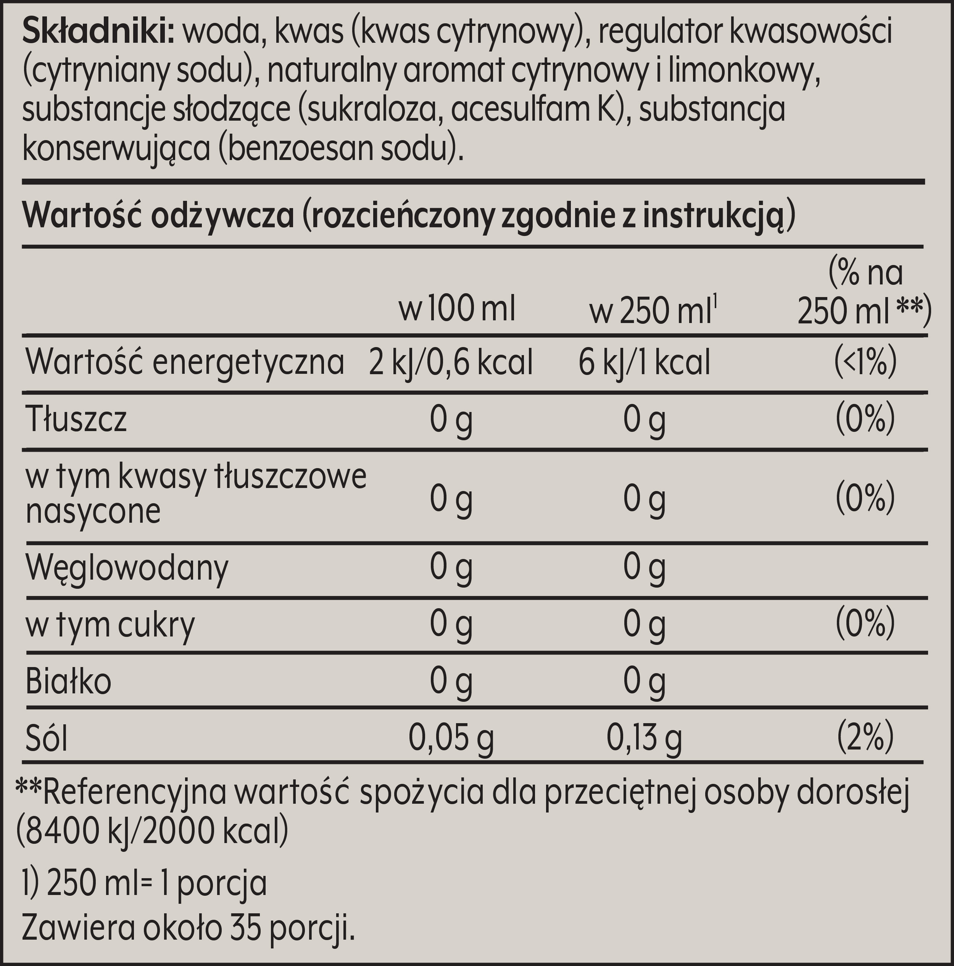 Zagęszczony napój o smaku cytrynowo-limonkowym bez dodatku cukru. Przygotujesz do 9 litrów napoju – przy zachowaniu zalecanych proporcji.
