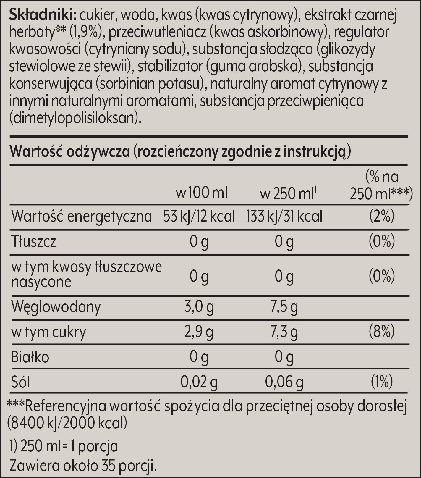 - Syrop na bazie ekstraktu z czarnej herbaty (1,9%) – autentyczny smak Lipton Ice Tea Lemon