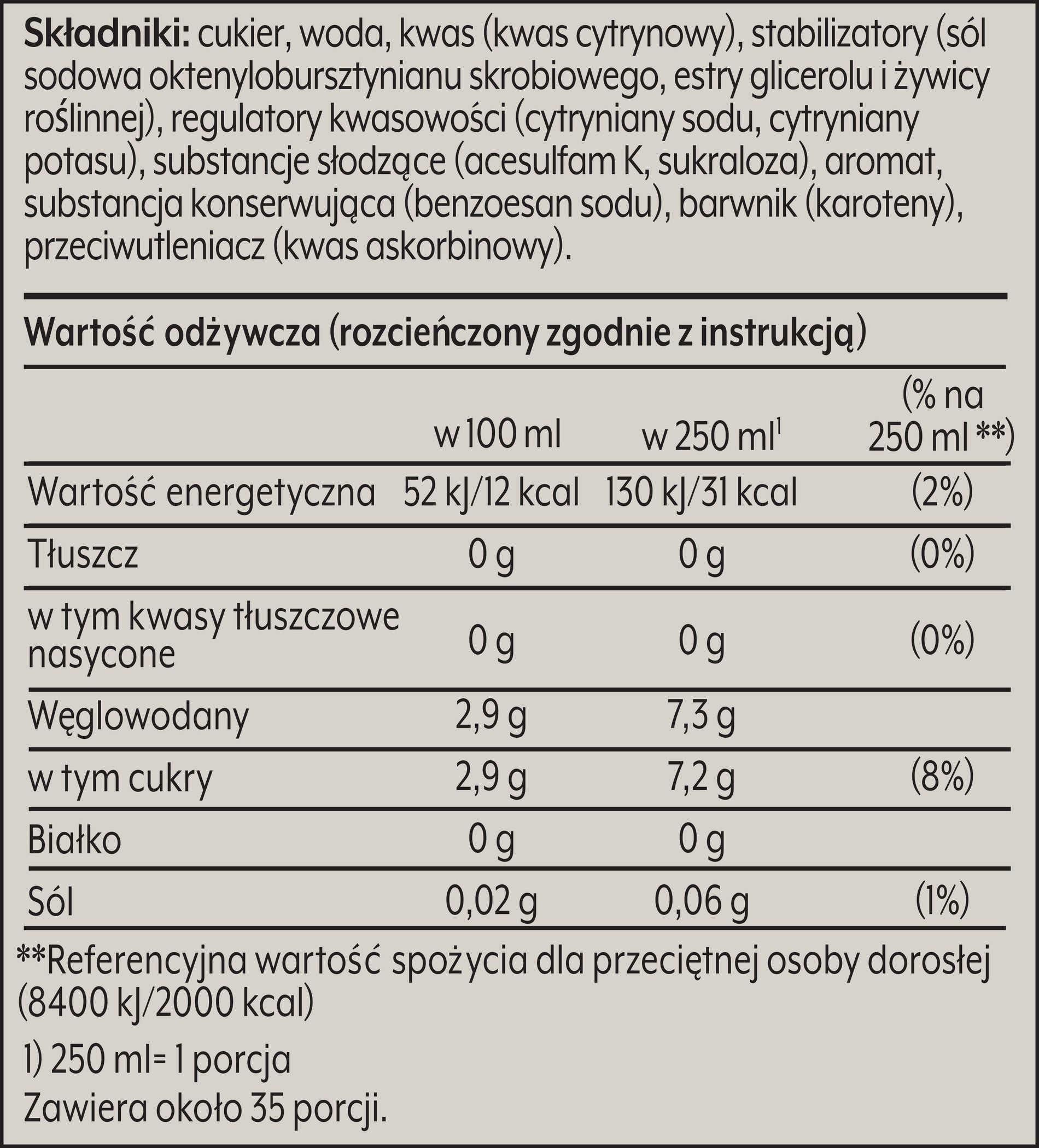 Zagęszczony napój o smaku pomarańczowym. Przygotujesz do 9 litrów napoju – jeżeli jest przygotowany zgodnie z instrukcją.