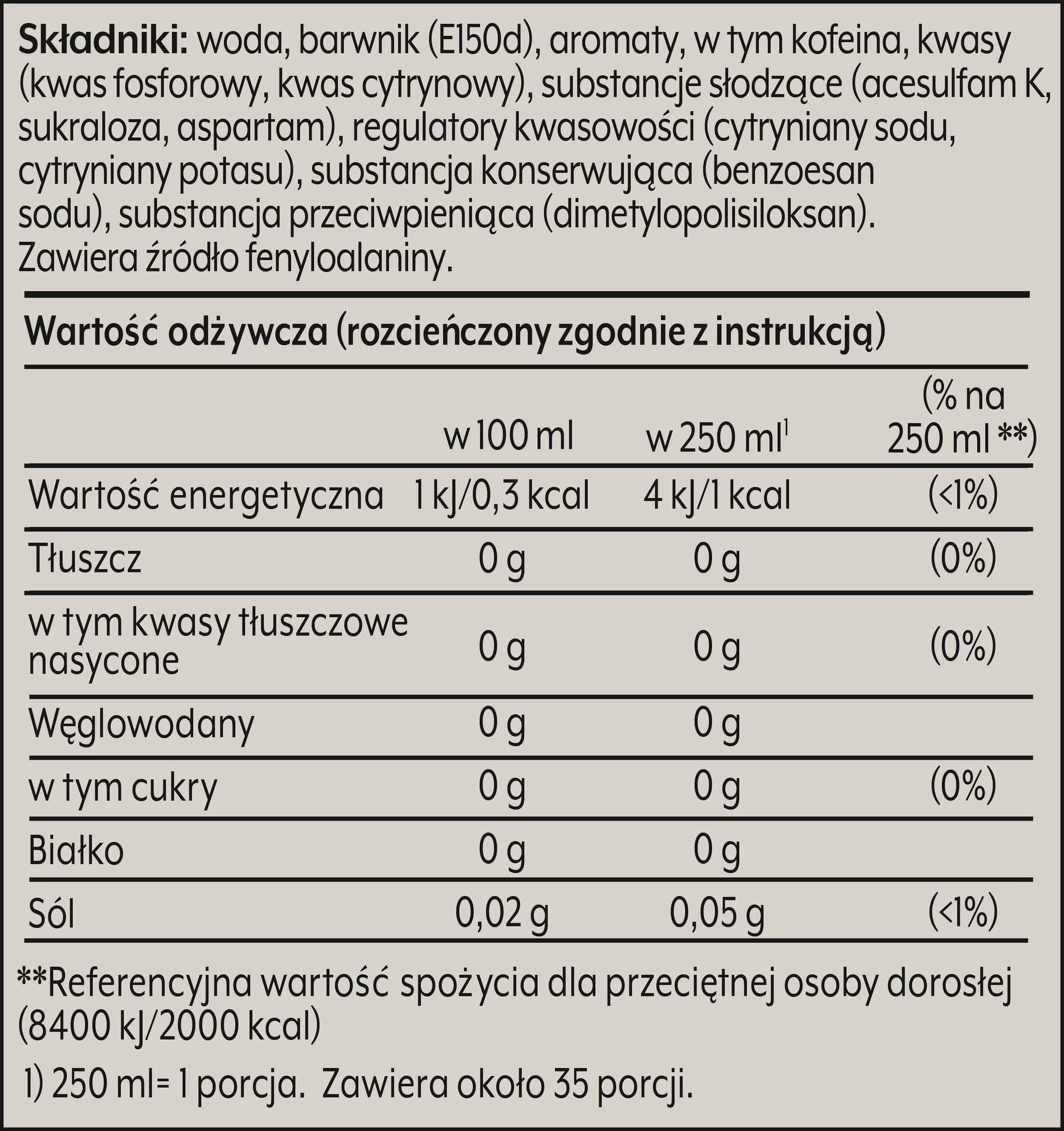 - Zawiera kofeinę – delikatne pobudzenie bez kalorii