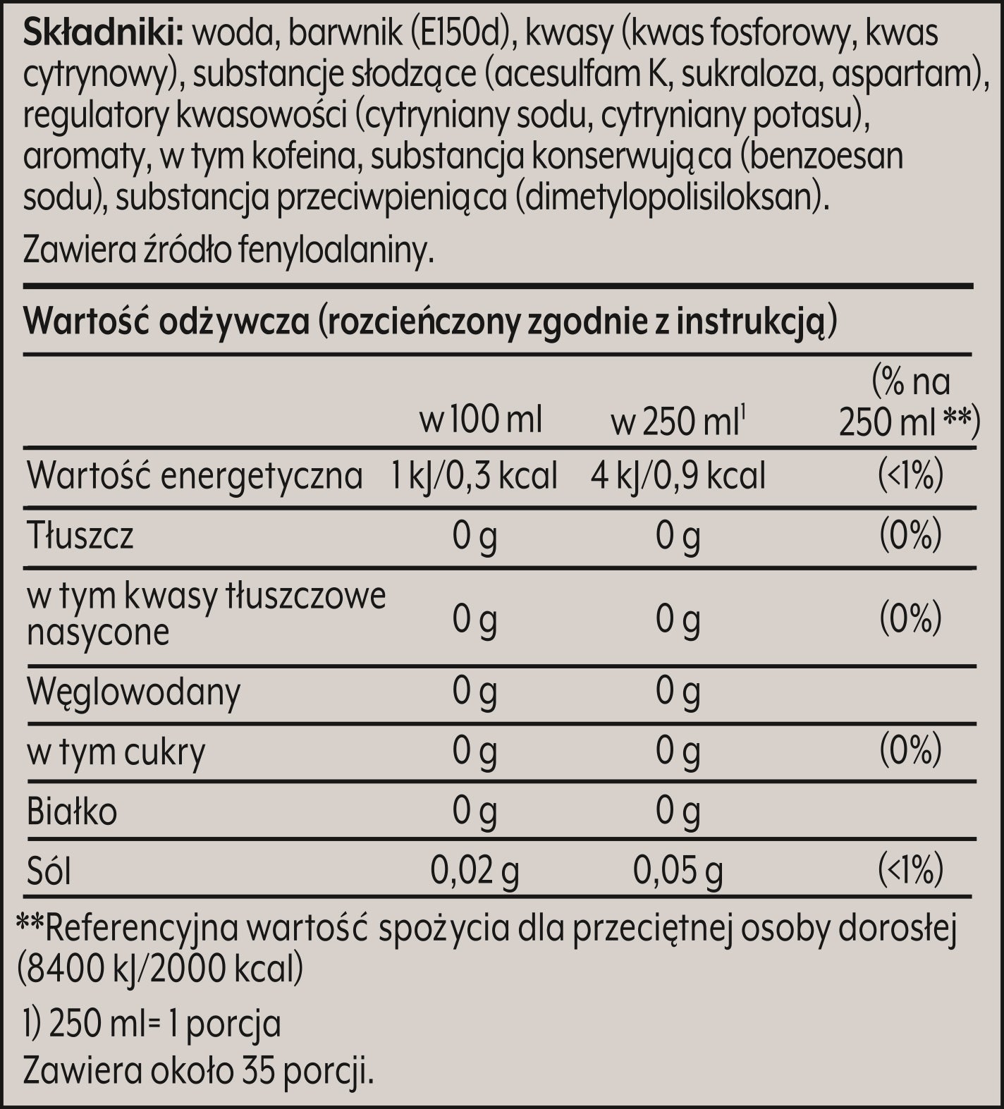 - Zawiera kofeinę i aromaty oryginalne dla Pepsi